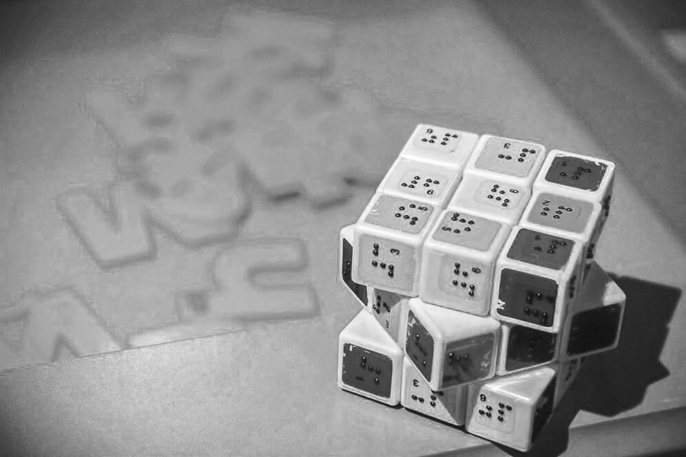 Я натыкаюсь на большой шкаф, где лежат книги и металлические пластинки. Как поясняет Александр, пластинки – это приборы для письма по Брайлю. Для изображения букв в шрифте Брайля используются шесть точек, которые расположены в два столбца. При письме точки прокалываются, и поскольку читать можно только по выпуклым точкам, «писать» текст приходится с обратной стороны листа справа налево, затем страница переворачивается, и текст читается слева направо. Взяв одну из книг стоящих на полке, я медленно вожу пальцами по множеству точек, не имеющих ничего общего с привычным алфавитом. Чтобы научиться пользоваться азбукой Брайля, писать и читать, человеку, потерявшему зрение, может потребоваться много времени, порой больше полугода.