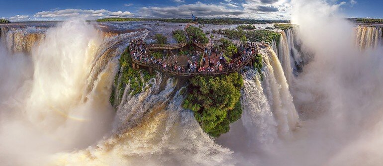 Водопадами Игуасу можно любоваться как со стороны Бразилии (г. Фос-ду-Игуасу), так и с аргентинского берега (г. Пуэрто-Игуасу). Сила падения воды сильна настолько, что район водопада практически всегда окружен плотным перламутровым облаком из микроскопических брызг.