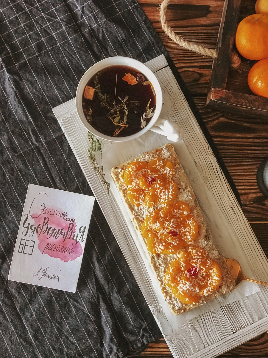 Калорийность всего кекса 500 ккал. Ингредиенты: Йогурт натуральный 2% - 150 гр. Творог обезжиренный - 150 гр. Яйцо - 1 шт. Овсянка - 60 гр. Ванилин - 1 ч.л. Апельсиновая цедра Сах.зам. или мед по вкусу Мандарин - 1 шт. для начинки и 1-2 для украшения Яйцо я заменила 1ст.л. семян чиа. Мандарины мне нравятся финские из банки. Дольки полностью очищенные. Йогурт я беру обычно 1,5%, а творог 0,1% Вместо сахара 70гр сиропа агавы(это примерно 130г сахара) Смешать овсянку, йогурт, творог, яйцо, ванилин, цедру, сах.зам. Все хорошо перемешать. Выложить 1/2 теста в форму. Мандарин очистить, разделить на дольки, положить на тесто, сверху выложить оставшееся тесто и в духовку на 20 минут. На готовый кекс выложить мадариновые дольки, посыпать кокосовой стружкой.