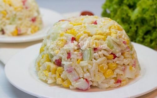 Богатый цветами и набором компонентов этот салат отлично подходит как дополнение к обеду, так и может служить полноценной заменой ужину. Здесь основное правило: не переесть. Нежно и вкусно в салате звучат крабовые палочки, которые удачно соединяются с другими продуктами. Для классического рецепта крабового салата возьмем: · 250 г крабовых палочек; · 4 яйца; · 2 свежих огурца; · банка консервированной кукурузы; · 100 г отваренного риса; · зеленый лук; · майонез; · соль. Вроде ничего такого особенного, но рис с огурцами подчеркивает вкус классического рецепта крабового салата. Это блюдо можно готовить по любым поводам, так как приготовление не составит особого труда и не займет много времени, но чаще его все таки подают на зимние праздники. Приготовим классический салат из крабовых палочек Яйца отвариваются вкрутую, остужаются, очищаются от скорлупы и нарезаются на мелкие кусочки. Крабовые палочки крошатся кубиками и высыпаются в салатник. Также нарезается и свежий огурец, который смеш