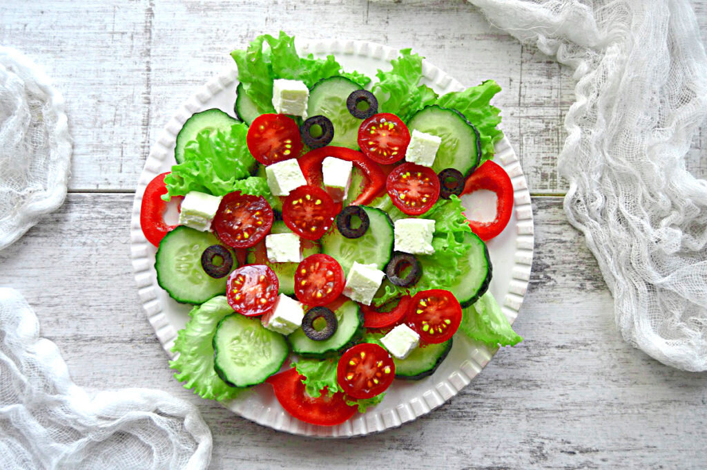 Летом выбирайте легкий салат из овощей, который не будет напрягать желудок и обеспечит огромную питательную ценность. Такие салаты готовятся мгновенно, они легкие, наполненные и очень вкусные. Благодаря им в организм поставляется ценные витамины. Хрустящий салат не только радует глаз разнообразием отдельных овощей. Это настоящая витаминная бомба, которая оказывает чрезвычайно полезное воздействие на ваше тело. Вы когда-нибудь задумывались о том, какие выгоды связаны с присутствием в ежедневном рационе салатов? Употребление салатов предотвращает запоры Употребление салатов снижает риск развития рака Употребление салатов снижает риск сердечного приступа Представляю вам 2 рецепта вкусных салата которые прекрасно подойдут на поздний ужин! Диетическая салат греческий Диетическая греческий салат не нуждается в рекламе. я думаю, мы все ее любим, а в этой версии он имеет всего 200 ккал! Греческий салат-это сочетание овощей с сыром фета и оливками. Соответственно это блюдо диетическое и зд