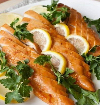 3. Вынимаем готовые грудки из духовки и остужаем. Нарезаем и подаем с дольками лимона.