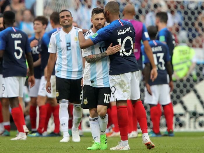 АРГЕНТИНА ВПЕРВЫЕ ЗА 60 ЛЕТ ПРОИГРАЛА НА ЧМ-2018,ВЕДЯ В СЧЁТЕ. Мбаппе отправил Месси домой. Но это был лучший матч чемпионата мира. Сборная Аргентины в матче 1/8 финала чемпионата мира проиграла французам (3:4). Ведя в счете по ходу второго тайма. Это четвертое в истории "безвольное" поражение аргентинцев на ЧМ. В последний раз такая неудача постигала их 60 лет назад – в июне 1958 года от немцев. Встреча прошла в Казани, игру посетили 42 873 зрителя.Матч завершилась со счетом 4:3 (1:1). Голы у французов забили Антуан Гризманн (13-я минута), Бенжамен Павар (57), Килиан Мбаппе (64, 68), у аргентинцев отличились Анхель Ди Мария (41), Габриель Меркадо 48), Серхио Агуэро (90+3). Килиан Мбаппе стал самым молодым футболистом за последние 60 лет, оформившим дубль в матче чемпионата мира. Нападающий забил два мяча в победной для французов игре 1/8 финала мирового первенства против сборной Аргентины (4:2), сделав это в возрасте 19 лет и шести месяцев. Самым молодым является бразилец Пеле,