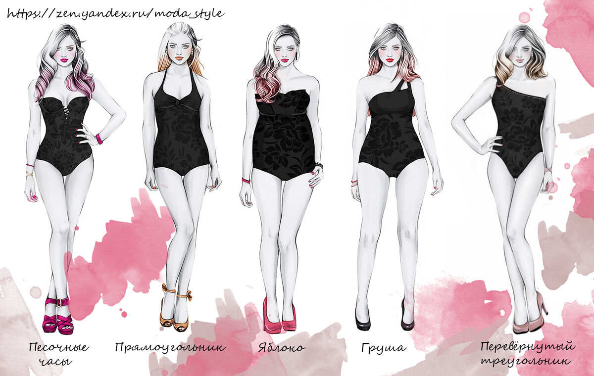 Этот пост посвящён теме выбора купальника, исходя из особенностей фигуры. Каждая из нас индивидуальна и неповторима, но, несмотря на оригинальность, все фигуры можно разделить на пять типов. О выборе купального костюма, ориентируясь на тип фигуры, и пойдёт речь. Если вы ещё не знаете к какому типу себя отнести, то обратите внимание на изображение ниже, а если вам уже знакома теория типов телосложения, то предлагаю подписаться на канал, поставить лайк и читать дальше =) Фотографии купальников я взяла из каталога одежды, поэтому не у всех девушек тип фигуры именно тот, о котором идёт речь, но модели купальников соответствуют описанию и критериям, о которых я и буду писать ниже. Песочные часы Фигура в стиле Ким Кардашян, Моники Беллуччи, Скарлетт Йоханссон . Многие ошибочно считают, что всё дело в пышных формах, на самом деле секрет кроется в пропорциях: ширина плеч равна ширине бёдер и ярко выражена талия. Фигура типа «песочные часы» может быть и у девушек со скромными формами. Фигура «п