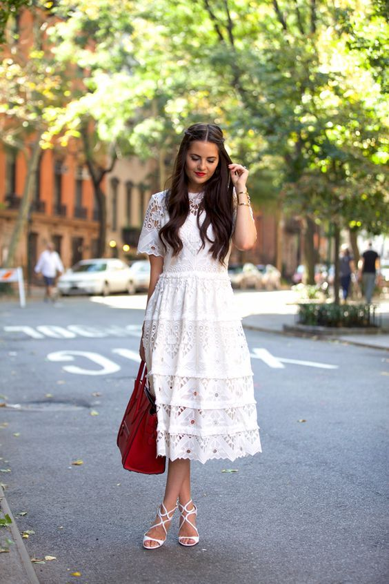 Казалось бы, такой универсальный белый цвет можно комбинировать с абсолютно разными оттенками, но мода диктует свои правила. Ниже приведены самые яркие и востребованные образы, в основе которых лежит простое белое платье. Вариант 1. Романтичное ажурное платье с элементами кружева лучше всего сочетать с аккуратными босоножками такого же белого цвета. А расставить цветовые акценты можно с помощью объемной красной сумки. Вариант 2. Игра контрастов – самый смелый тренд! Белое всегда хорошо сочетается с черным. Шифоновое легкое платье можно разбавить тонким черным поясом, массивными ботильонами, аккуратной сумкой, гетрами и шапкой. Вариант 3. Более сдержанный и строгий формат – белоснежное платье-футляр, дополненной тонким кожаным ремнем на талии, массивным черным браслетом и черными туфлями с серебристыми вставками на носах. Вариант 4. Свободного кроя хлопковое платье с рукавами в молодежном стиле безупречно дополнено жилеткой из светлого потертого денима, объемными аксессуарами. Сумка