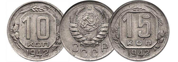 6. Редкость 10 и 15 копеек 1942 года, которые ценятся по 15.000 рублей каждая, можно объяснить так. После переезда монетного двора из Ленинграда, на Урал, в