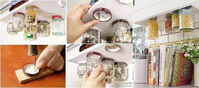 Идея № 1 Баночки для специй, круп и макарон, больше не займут всю полку! Теперь они самостоятельно могут парить в воздухе. Не спешите вызывать скорую помощь. Просто есть такое замечательное решение, крышечки баночек прикрутить шурупами к дну навесного шкафа, он будут прекрасно держаться! А ещё можно для этих же целей использовать металлическую полоску и магниты, заранее приклеенные к крышечкам. Хотя вариант с шурупами способен выдержать больший вес. Идея № 2 Чашки можно определить туда же. Для этого просто купите специальные кухонные крючки. Они бывают разными. Это решит сразу две проблемы: во-первых, места на столах и в шкафчике станет больше, а во-вторых, исчезнет вечный вопрос из сказки "Где моя большая кружка???". А ещё, это можно превратить в самую настоящую выставку! Если чуть больше приложить к этому усилий и подойти к работе творчески... Идея № 3 Куда же девать сковородки!?!?!? Как вы уже поняли, в вопросах экономия места. Крючки наше всё. Почему бы не решить проблему вот
