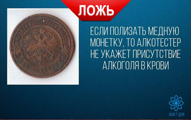 Некоторые говорят, что, если вы выпили и вас направляют на алкотест, достаточно лизнуть медную монету, чтобы пройти тест Идея заключается в том, что медь из монеты вступит в некую химическую реакцию с алкоголем в вашей слюне, и это исказит показания алкотестера. По иронии судьбы, сама идея использовать медную монету является в большей степени мифом, так как уже несколько десятилетий монеты делают из других металлов. Но даже если бы то небольшое количество меди в монете было в состоянии вступить в реакцию с алкоголем в вашей слюне, это вам не помогло бы. Алкотестер определяет содержание алкоголя в крови замеряя уровень алкоголя в воздухе, выдыхаемом из нижнего отдела легких. Содержание алкоголя в воздухе в этой части легких на самом деле очень близко к содержанию алкоголя в крови. По-видимому, медная монета — самый часто упоминаемый кандидат на роль волшебного средства для борьбы с алкотестером, хотя временами можно услышать советы использовать пастилки от кашля, арахис, порошок карри,