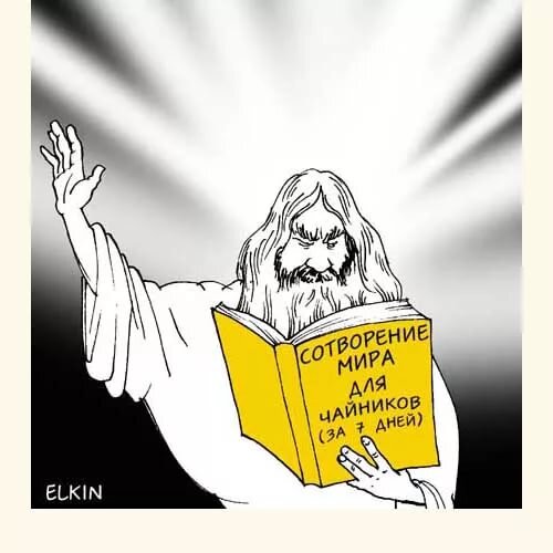 Вот в Коране сотворение мира описано предельно просто: Аллах сказал "Будь" и все само собой сделалось. Наш же создатель не обладал такой силой и мир создавал постепенно, по частям. Так как Господь был демиургом начинающим, взял он справочник "создание миров для чайников" и начал действовать строго по инструкции. Вы спросите, с чего я решил, что демиург был неопытный? А я отвечу: вы посмотрите сколько нелепостей и недоработок в этом мире. Взять хотя бы число "пи". Ведь надо же суметь сделать так, чтобы число было бесконечным. Нормальный создатель сделал бы это число конечным, желательно целым, чтобы была возможность точных математических вычислений, а то, что имеем мы: сколько тысяч знаков после запятой вычислили, а конца не видно. Или взять такое явление как вес, да да, обыкновенный вес благодаря которому мы ходим по земле а не порхаем по воздуху. Создатель как то не предполагал, что его дети попадет в космос и поэтому функцию веса в космосе не предусмотрел. Вот и болтаются космонавт