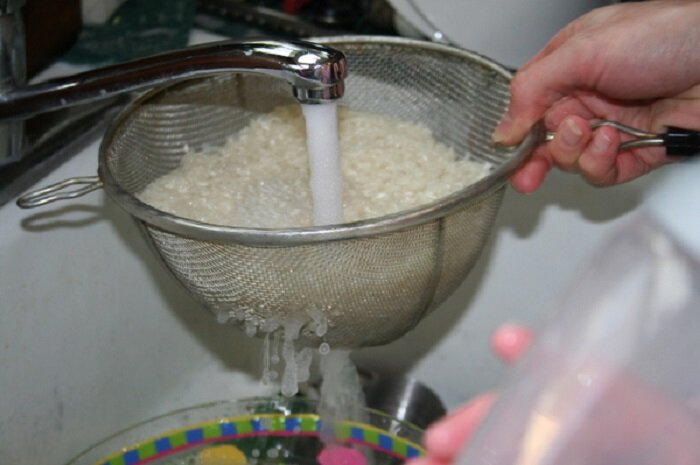 Компонент нужно промывать под водой, для того чтобы устранить из крупы небольшой мусор и пыль. Данная процедура помогает придать рису насыщенный и яркий вкус. Промывать злак можно как в сите, так и в глубокой миске, однако второй вариант считается более удобным. Насыпав крупу в посудину, её нужно залить холодной водой и немного помешать крупинки рукой. Промывать рис следует до 5 раз (каждый раз заливая свежую воду), пока жидкость не станет прозрачной.