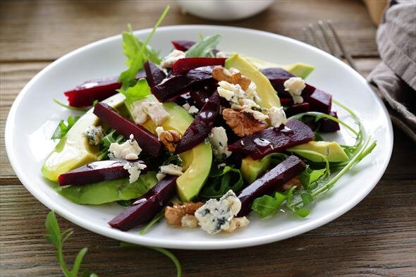 - Свеклу и авокадо нарезать дольками, авокадо сбрызнуть лимонным соком, чтобы оно не потемнело.