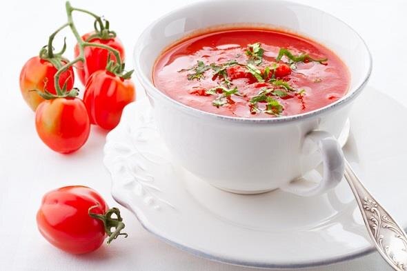 Рецепт этого холодного томатного супа пришел к нам прямиком из Испании и сразу завоевал огромную популярность. Ингредиенты: - Помидоры — 450 г - Репчатый лук — 1 шт. - Болгарский перец — 1 шт. - Огурцы — 1 шт. - Томатный сок — 3 стакана - Кинза — 1 пучок - Красный винный уксус — 50 мл - Оливковое масло — 4 ст.л. - Соус табаско — по вкусу - Соль и перец — по вкусу Способ приготовления: