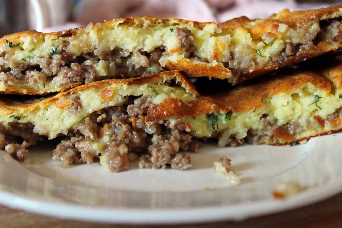 Привет! :) От вчерашних тефтелей из этого рецепта у меня осталось немного фарша (не влез в сковородку), а хранить его в холодильнике долго нельзя, поэтому с утра сделал запеканку в картофельном тесте. Нам понадобится: - Фарш - Картофель - Мука - Яйца - Зелень - Растительное масло Как готовить: Фарш обжарить, как обычный фарш, до почти полной готовности. Картофель отварить, как на пюре. Дальше придется чуть-чуть повозиться. Делать так: размять картошку, добавить в него кусочек сливочного масла и немного зелени, два (или одно) яйца, хорошо взбить в однородную массу, постепенно добавлять 6-12 столовых ложек с горкой муки и взбивать пюре венчиком. В итоге получится липкое тесто. Оно-то нам и нужно :) На противень постелить пергаментную бумагу или рукав для запекания, смазать немного растительным маслом, выложить первый слой картофеля, на него посередине – фарш. Сверху остатки картофеля, и обмазать с краев теста фарш, чтобы фарш закрылся. И в разогретую на 180 градусов духовку на 40 мин