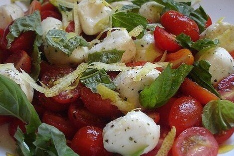 9. Красный лук - 1 головка Инструкция приготовления 1. Нарезать помидоры на четвертинки. Нарезать лук тонкими колечками. Нарезать сыр кубиками. 2. Для соуса масло вылить в ковшик и слегка подогреть, добавляя в него раздавленный чеснок, травы и уксус. Перемешать и полить салат. Украсить листочками базилика.