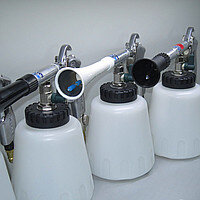 На автомобильной химчистке можно найти массу приспособлений, ускоряющих работу мойщиков и улучшающих качество чистки. Один из популярных аппаратов для пневмохимчистки - Торнадор (Tornador), изобретенный Дэнисом Дэном из США и японскими специалистами. Агрегат отлично справляется с загрязнениями в труднодоступных местах, куда не доберётся даже пылеводосос. Аккуратно и экономично распыляя чистящее средство, торнадор оставляет обрабатываемую поверхность чистой и практически сухой.