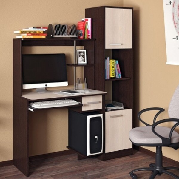 • Если вы вынуждены ютиться в тесной комнате или небольшом кабинете, а самый маленький стол компьютерный вас не устраивает, выбирайте варианты с большими верхними надстройками. Чтобы полочки находились не по бокам, а сверху, над пространством для монитора. Среди современных угловых компьютерных столов фото каталогов демонстрируют очень удобные модели с тумбами внизу и надстройками сверху: они компактны, но в то же время очень вместительны