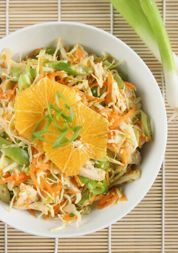 Как следует из названия, это блюдо подойдет для вегетарианцев. Почему корзина? Да потому что среди ингредиентов широкий спектр как овощей, так и фруктов. Потребуется 200 граммов белокочанной капусты, одна морковка, пучок редиса, петрушка и сельдерей. Также в салат пойдет стручок сладкого перца. Он является своеобразным мостиком от овощей к фруктам. Возьмем апельсин, яблоко и киви - по одной штуке каждого вида. Их нужно мелко нарезать. Что касается овощей, то принципиально важно капусту, нарезанную соломкой, перетереть с солью и сахаром. Выигрышнее будет натереть морковку на крупной терке, а редис - наоборот на мелкой. Также некрупно порубить сладкий перец и зелень.
