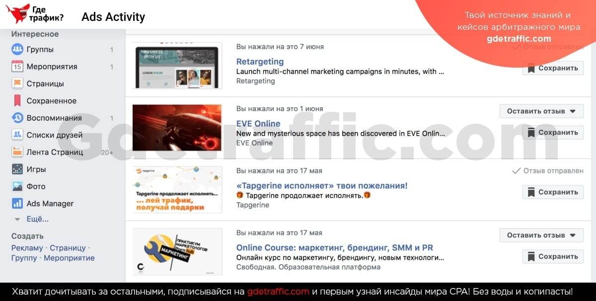 Найти новый инструмент можно на вкладке «Недавние действия с рекламой» в разделе Ads Activity. У юзера есть возможность пересмотреть всю рекламу, с которой он взаимодействовал, и оставить отзыв. Также соцсеть предложит пользов