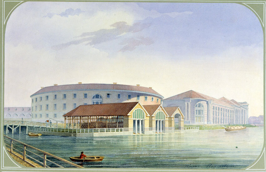 Литография акварели с видом морской тюрьмы в Новой Голландии. За круглую форму была прозвана "бутылкой". В дали просматривается здание для хранения и сушки корабельной древесины , а вот лёгкие ангары/сараи со слипами для спуска на воду хранимых там шлюпок - эти на сегодня не сохранились.