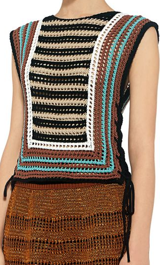 Такой потрясающе простой и необычный топик, хоть прямо все бросай и начинай вязать! И связать-то его можно из остатков пряжи! Сначала вяжем два прямоугольника (на перед и спинку), а затем по кругу обвязываем их, выполняя по четырем углам расширения. Вместо боковых швов - шнуровка! гениально простая модель! А эти платьишки вяжутся примерно по такому же принципу, только без начальных прямоугольников. Я бы связала такое платье даже из одного вида пряжи (и одного цвета, можно меланжа) А если также связать топик, но только ажурным узором - будет просто шедевр! Где-то такой даже видела, найду - покажу.