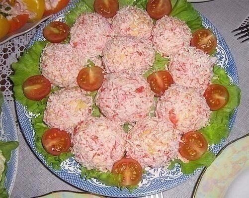4. Из приготовленной массы скатать шарики величиной с конфету "Рафаэлло" и обвалять их в предварительно натертых на мелкой терке крабовых палочках.