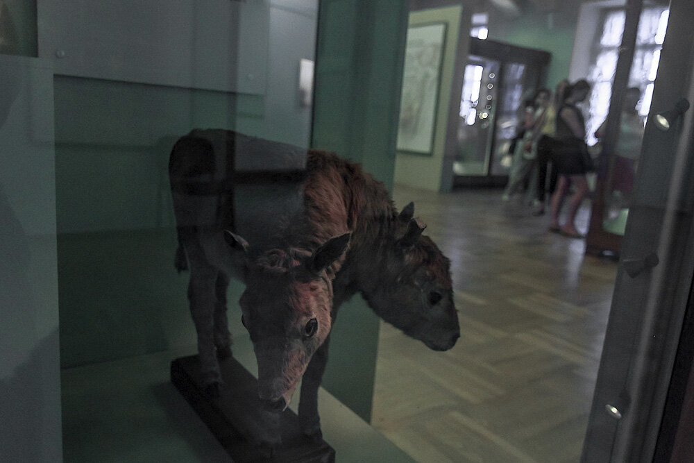Кунсткамера - один из самых известных и популярных музеев России. Здесь всегда полно посетителей, но многие из них покидают музей разочарованными. Ожидая от Кунсткамеры чего-то экстраординарного, они попадают в дотошный этнографический музей, а знаменитые анатомические коллекции умещаются в одном зале. Их мы сегодня и увидим. Чучело двуглавого телёнка.