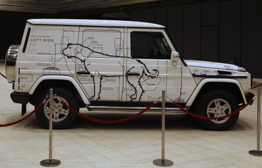 На аукционе современного искусства, прошедшем в Гонконге с эстимейтом 300 тыс. долларов США был выставлен автомобиль Мерседес-Бенс G-класса, украшенный великолепными изображениями ирландского волкодава. По легенде Аукционого дома, владельцем этого автомобиля был некий европеец, давно живущий в Японии, и у которого был ирландский волкодав по имени Фрэнсис Бэкона. Именно для его перевозки и был приобретен премиальный внедорожник. Надо понимать, что ирландский волкодав - самая крупная в мире собачья порода, и для его достойной транспортировки обычный авто малопригоден. Вам потребуется по меньшей мере вместительный внедорожник, причем вашими останутся только передние сиденья, т.к. собака легко займёт всю доступную ей площадь. Изображение собаки на автомобиле выполнено, кстати, в масштабе 1:1 - можно оценить габариты. Когда Фрэнсиса Бэкона не стало, хозяин больше не смог ездить на этой машине. Aй Вейвей, именитый китайский художник, услышал эту историю и в 2011 году разрисовал автомобиль