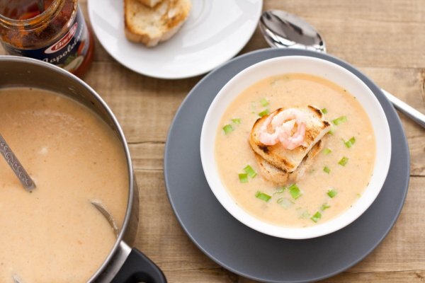 Для приготовления этого простого и вкусного суп-пюре нам потребуются следующие ингредиенты ИНГРЕДИЕНТЫ: креветки 400 г сыр плавленый 100 г масло сливочное 50 г стебель сельдерея 2 шт. лук репчатый 1 шт. соус томатный 3 ст.л. мука 2 ст.л. тимьян сушеный 1 ч.л. лавровый лист перец черный молотый соль ПРИГОТОВЛЕНИЕ: 1. Обдать креветки кипятком, удалить головы, снять панцири. 2. Залить панцири литром воды, варить полчаса. 3. Мелко порубить пару черешков сельдерея, нашинковать луковицу, пассеровать в разогретом сливочном масле. 4. Всыпать половину креветок, добавить томатный соус, всыпать муку, очень хорошо перемешать до получения густой однородной массы, прогреть пару минут, убрать сковороду с плиты. 5. Готовый бульон процедить, соединить с содержимым сковороды, перемешать, посолить сырный суп с креветками и сельдереем, поперчить, положить тимьян, несколько лавровых листиков, варить 10 минут. 6. Убрать с плиты, достать лавровый лист, разбить блендером до состояния пюре. 7. Положить оста