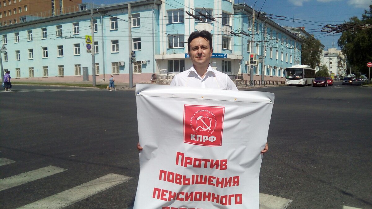 Как мы уже сообщали, в эти выходные представители сразу же нескольких политических партий проводят акции протеста против планов Правительства РФ по повышению пенсионного возраста. В 12 часов дня в парке 850-летия прошел митинг сторонников Справедливой России, собравший не более ста человек по причине низкой организованности и слабой подготовительной работы местного отделения. Но первыми в 11 часов утра выступили одиночными пикетами члены партии "Коммунисты России", в том числе бывший пресс-секретарь регионального отделения КПРФ Андрей Никольский. Активисты политической партии, которую часто путают с КПРФ, пикетировали здание Пенсионного фонда, городскую администрацию и пару городских перекрестков. Фото из личного твиттера Александра Мурина. Представители же КПРФ провели серию одиночных пикетов по всему городу. Как сообщалось ранее, их количество должно было быть не менее двадцати. Пикетировавший напротив здания регионального исполкома партии "Единая Россия" первый секретарь областно