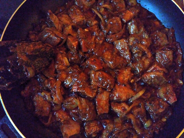 По названию можно догадаться, что это блюдо индийской кухни. Готовится довольно просто, но более-менее долго — часа полтора. Как и виндалу, это блюдо можно готовить с использованием любого мяса или птицы. И с остротой тоже можно поиграться — сделать совсем не острым, либо наоборот, соорудить экстремальную острятину, как вышеупомянутое виндалу. Я, разумеется, перца не пожалел. Для приготовления нам понадобится: Мякоть говядины — 500 гр Лук — 1 луковица среднего размера Чеснок — 2-3 зубчика Имбирь — 15 гр Помидоры нарезанные в собственном соку — 1 банка (400 гр) Кориандр молотый — 1 ч.л. Тмин молотый — 1 ч.л. Куркума — 1 ч.л. Перец черный молотый — 1 ч.л. Лимонный сок — 2 ст.л. Перец чили — по вкусу Соль — по вкусу Растительное масло Мясо режем на кубики по 2-3 см, лук полукольцами. Чеснок с имбирем натираем на самой мелкой терке и кладем в какую-нибудь мисочку. В эту же мисочку закидываем все приправы и лимонный сок, хорошенько перемешиваем все это дело. В сотейнике или большой сковоро