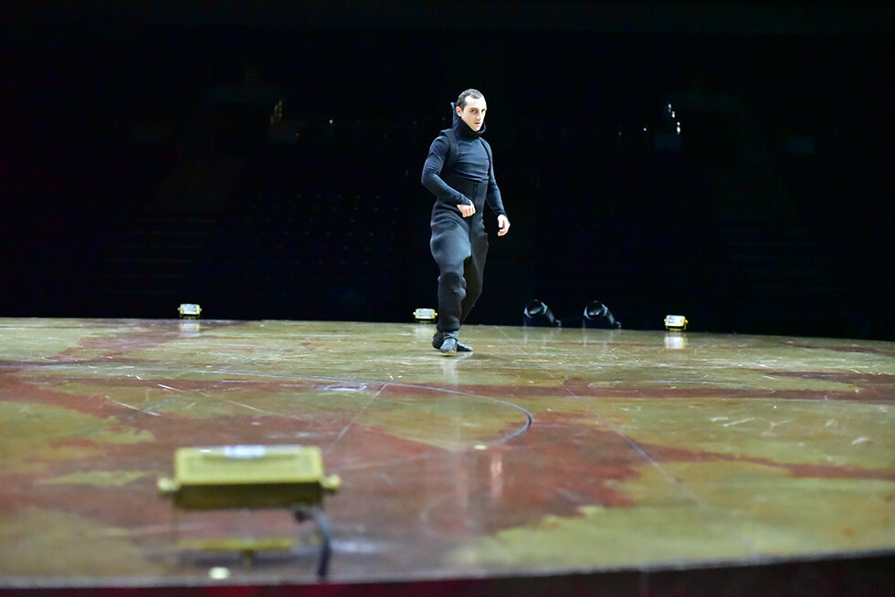 Все началось с репетиции на главной сцене, монтаж которой занимает всего один день, и этот момент очень важен, так как несмотря на то, что артисты досконально знают свои «роли», всегда найдется, что улучшить. Очень важно настроить верно звук, почувствовать зал, масштаб, ведь новое место диктует свои правила, и их нужно обязательно учесть, чтобы шоу было именно таким, как задумал режиссер. В момент нашего прихода на сцене были три грузинских артиста, они репетировали свой номер с акробатическими прыжками и элементами лезгинки.