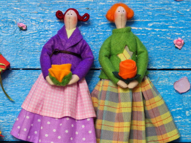 Это мечта бабушкиного сундука, именно то, во что мы и сами готовы нарядить кукол, во что их бы нарядили наши бабушки. Лоскутки из хлопка в цветочек и горошек, в полосочку и клеточку, тонкие хлопковые кружева, шёлковые ленточки и яркие пуговки, вышитые цветочки и даже льняные мешочки в руках, набитые ароматными травами.