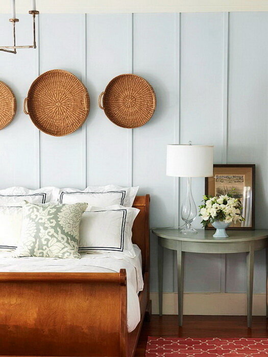 Несколько интересных решений для оформления интерьера спальни. Неброское сочетание цветов и несколько чемоданов в стиле винтаж и итнтерьер спальни преображается. Стена в изголовье кровати оформлена небольшими и разными по форме нишами. Любимые фотографии и милые сердцу вещицы украсят эту импровизированную экспозицию. Книжные полки в изголовье кровати - правильное решение, если Вы не засыпаете без чтения на ночь. Кипельно белое постельное бельё, плетёный сундук, кровать с "шишечками", старинные фото - здесь приятно находиться и отдыхать. Благородные цветовые сочетание, позолота, бархат и атлас в текстиле и впечатление от интерьера спальни совсем иное - роскошь и основательность. Спальня с нотками Прованса в интерьере - лавандовый цвет, плетёная мебель, скошенный потолок с балками. Бирюзовый и голубой цвета всегда создают ощущение прохлады и свежести вокруг. Добавьте в оформление интерьера спальни эти цвета и эффект нахождения в загородном доме Вам обеспечен. Название интерьерного с