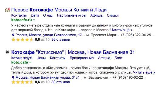 Как вы могли догадаться, взглянув сегодня на результаты поиска, — мы не зря столь активно обращали ваше внимание на рейтинг вашей организации в Справочнике. Теперь он отображается не только на Картах, но и в Поиске: Этому нововведению предшествовал эксперимент, в ходе которого мы убедились, что подобное отображение рейтинга помогает пользователям делать выбор, которым они с наибольшей вероятностью будут довольны: ведь в нём учтено не только качество сайта, но и качество бизнеса, который скрывается за этим сайтом. Рейтинг будет показан в десктопной версии Поиска для всех сниппетов главных страниц сайтов организаций, присутствующих в Яндекс.Справочнике, независимо от источника их добавления: сделал ли это сам владелец или другие пользователи. Исключение — сайты сетей, в которых присутствует сразу несколько филиалов, для них систему отображения в поиске мы доработаем в ближайшее время. Чтобы следить за рейтингом и отзывами было удобнее, мы рекомендуем ещё раз убедиться, что вы не забыл