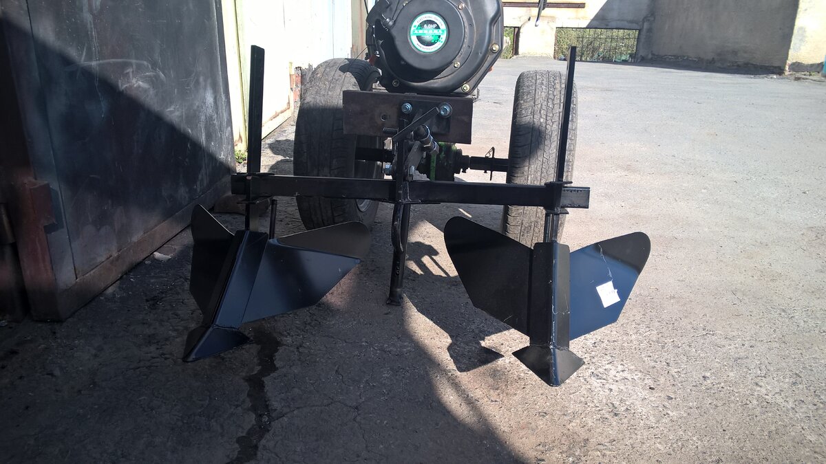 дизельный мотоблок " Аврора" и двойной окучник. Пробовал нарезать грядки под картофель расположение окучника сзади мотоблока, очень тяжело и криво выходит. Посмотрел видео в youtube знающие люди подсказали переставить в перёд, теперь он практически сам всё делает ровно и красиво получается. При пахоте я использую грунтозацепы, а автомобильные колёся для транспортировки. Окучивать этими окучниками грубо получается, а вот дисковыми очень хорошо и на много легче, в этом году впервые попробовал. Ниже фотография обработал дисковым окучником, в следующей статье выложу фотографию самого окучника.