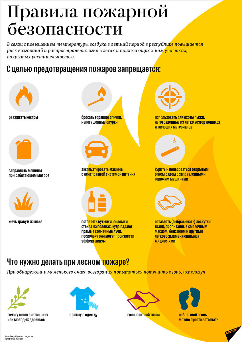 Ознакомится с правилами пожарной безопасности можно в инфографике Sputnik Армения. В связи с повышением температуры воздуха в летний период в Армении повышается риск возгораний и распространения огня в лесах и прилегающих к ним участках.