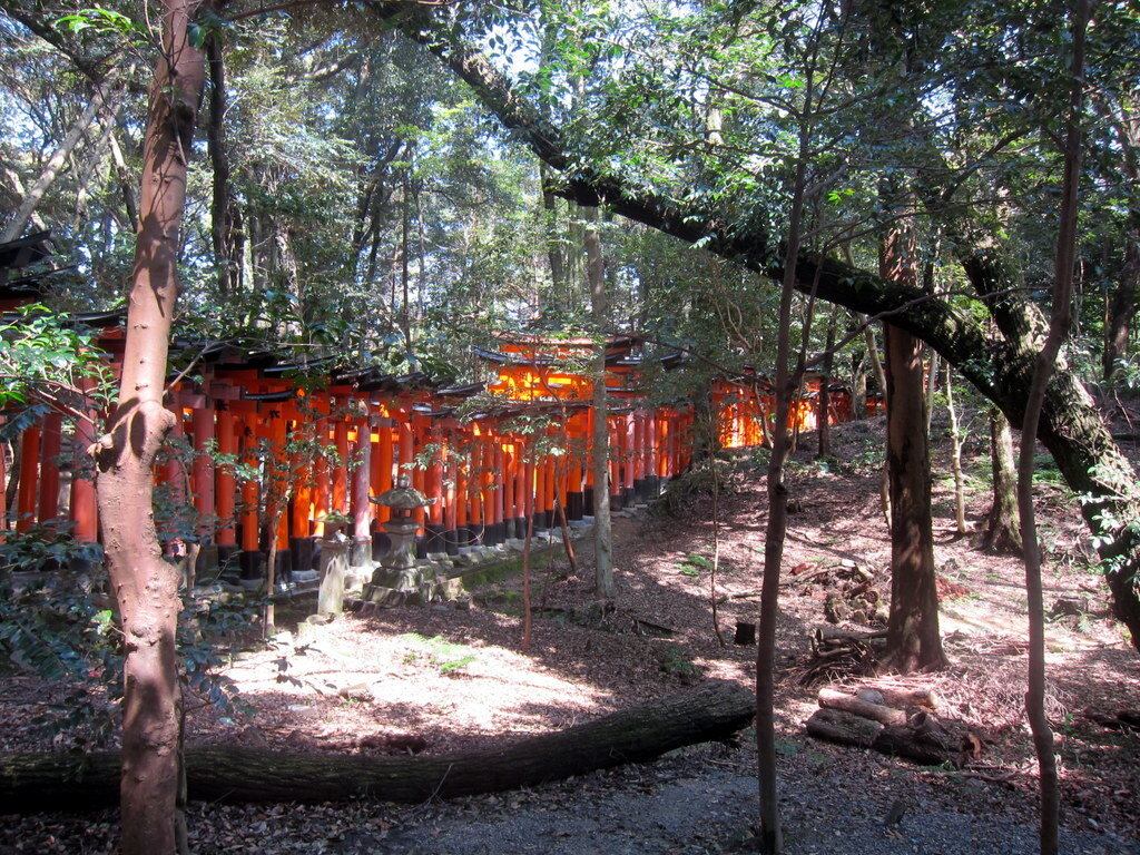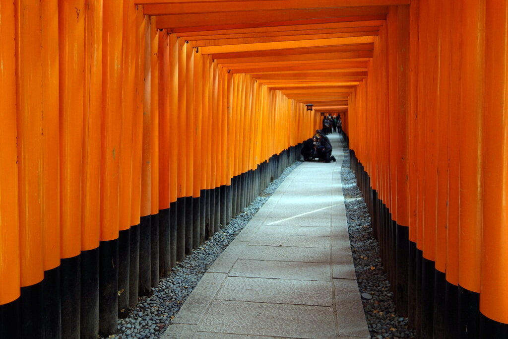 Святилище богини Инари, в местечке Фушими на окраинах Киото. Оно знаменито своими оранжевыми воротами тории. Ворота стоят вдоль тропинок так плотно, что формируют оранжевые туннели по которым можно гулять. Символика лисы - посланицы Инари - видна повсюду на территории. Здесь легко можно пробродить весь день.