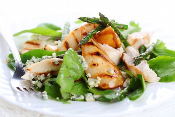 Салат из рукколы, карамелизованных груш, копченой утиной грудки и козьего сыра.