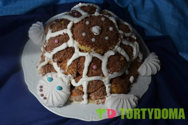 Ингредиенты Для теста: Для крема и посыпки: Для украшения (по желанию) Приготовление Взбиваем яйца с сахаром и ванилином, пока не растворится сахар. Смешиваем просеянную муку с разрыхлителем и вмешиваем в тесто по частям, до однородной массы. Тесто должно получиться без комочков, по консистенции плотнее, чем густая сметана. Теперь займемся выпечкой лепешек для торта. Их можно печь тремя способами: 1. Ложкой или кондитерским мешком наливать на пекарскую бумагу небольшие кружки и выпекать в духовке. В этом случае лепешки будут плоские и хорошо пропитаются. Минус такого способа в том, что форма не всегда получается одинаковой, что потом отразится на торте; 2. Выпекать в формочках для кексов. Наливаем по половине ложки в каждую формочку, так, чтобы только прикрыть дно формочки. В этом случае мы получим ровные лепешки одинаковой формы. Минус в том, что они могут получиться слишком толстые и плохо пропитаться; 3. Вылить тесто ровным слоем на бумагу, испечь, а потом стаканом вырезать кружки