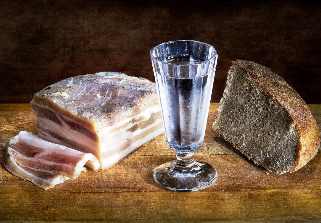 Сало практически полностью состоит из насыщенных и не насыщенных жирных кислот. На 100 грамм продукта приходится 770 килокалорий. В составе сала много и полезных для человека веществ: витамины В, Е, D, F, группы В, никотиновая кислота, аминокислоты, пальмитиновую, линоленовую, линолевую, олеиновую кислоты, «мозговой» холестерин, а также ненасыщенную арахидоновою кислоту, которая не присутствует в растительных жирах. Сало крайне высококалорийный продукт, но если не хотите обзавестить своим салом, то, конечно же нужно употреблять его в меру. И доктора и ученые, совершенно не возражают против поедания сала, 20-30 г с ржаным хлебом ежедневно принесут только пользу. Что же касается сала как закуски к водочке, то те же мюнхенские ученые установили, что сочетание сала с крепким алкоголем не только не нанесет вред, но и наоборот принесет пользу. Сало обволакивает желудок, способствует выработке ферментов пищеварения и замедляет всасывание «градусов», а спиртосодержащий напиток помогает пер