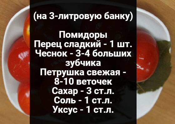 Самые вкусные рецепты соления готовили еще наши бабушки! Кисло-сладкий рассол просто сводит сума, не в одном магазине такого не найдешь! Обязательно поставьте мне оценку своими красивыми пальчиками палец вверх ☝)) Продукты: Способ приготовления: 1. Промываем помидоры, прокипятим банки. 2. Выкладываем на дно чеснок и петрушку. 3. Теперь выкладываем помидоры. 4. Сверху выкладываем нарезанный перец. 5. Нальем в банку кипяток и сольем его в кастрюлю, вскипятим вновь. 6. Нальем 9% уксус, соль,сахар.( соль и сахар я кладу по рецепту своей бабушки, если вы любите сильно соленые, добавьте больше соли или сахара). 7. Зальем кипятком и закатываем банки. Зимой самое удовольствие попробовать этот чудесный бабушкин рецепт! Приятного Аппетита!!!! Попробуйте так же: Быстрые сырные лепешки Лепешки из 3-х продуктов Сыр домашний со специями Чипсы в микроволновке Печенье с кунжутом за 10