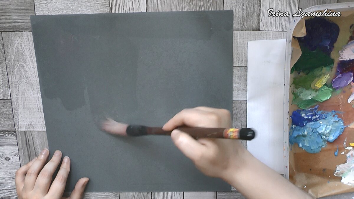 Лето манит нас сочными ягодами. Приглашаю вас нарисовать яркую клубнику в технике двойного мазка вместе со мной. Инструменты и материалы: 1. Нам нужны будут плоские синтетические кисти №22, 16, 10, 6. Для наброска я использую круглую кисть №3. Для тонких линий - круглую кисть №1. 2. Возьмите темперные или акриловые краски. 3. Палитра. Подойдет обычная керамическая тарелка или вы можете использовать специальную палитру для акриловых и темперных красок. Как ее сделать, вы узнаете в моей прошлой статье. Для растушевки двойного мазка я использовала бумажную палитру. 4. Возьмите бумагу плотностью 200 - 300 г / м². У меня бумага серого цвета. Прежде всего нам нужно создать красивый фон. Увлажним бумагу с помощью большой кисти. Теперь закрасим почти весь лист белой краской. Постарайтесь сделать это быстро, мы должны использовать преимущества влажной бумаги. Сейчас можно постепенно вводить другие оттенки, перемешивая краски прямо на бумаге. Поскольку поверхность листа влажная, вы легко рас