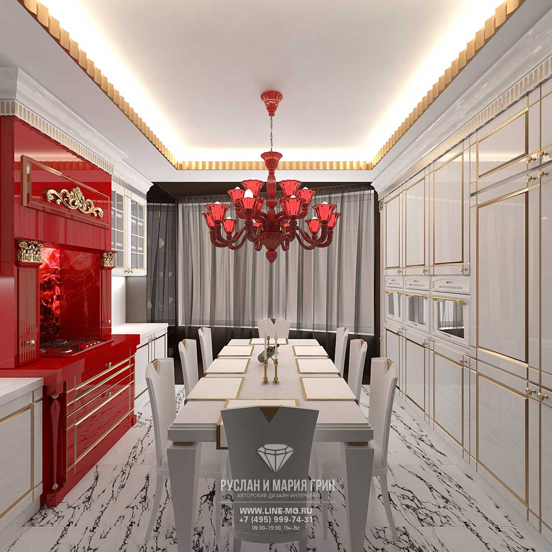В интерьере белой, вытянутой в длину кухни также не обошлось без ярких акцентов. Красная люстра и варочная зона алого оттенка лишили комнату присущей ей монохромности.