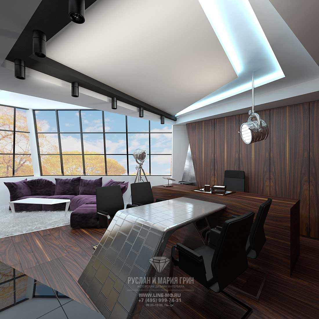 Кабинет делового человека требует тщательного продумывания и проектирования планировки. Ведь в этом помещении проводятся не только кратковременные собрания персонала с обсуждением рабочих моментов, но и длительные встречи с партнерами, подписание договоров, просмотр презентаций и прочие важные бизнес-процессы. Поэтому частные дизайнеры интерьера Руслан и Мария Грин приложили максимум усилий для оформления рабочего пространства одного из своих заказчиков. Основной проблемой в их работе стал небольшой размер будущего кабинета. ФУНКЦИОНАЛЬНОЕ ЗОНИРОВАНИЕ В ДИЗАЙНЕ КАБИНЕТА РУКОВОДИТЕЛЯ МАЛЕНЬКОЙ ПЛОЩАДИ Дизайн кабинета руководителя мужчины. Фото На фото интерьера кабинета мужчины-руководителя видно, что помещение разделено на две функциональных зоны. Рабочая зона меблирована массивным столом для работы и переговоров, дополненным удобными креслами и стильным подвесным светильником в форме прожектора. Так как любая презентация невозможна без использования качественной электроники, помещени