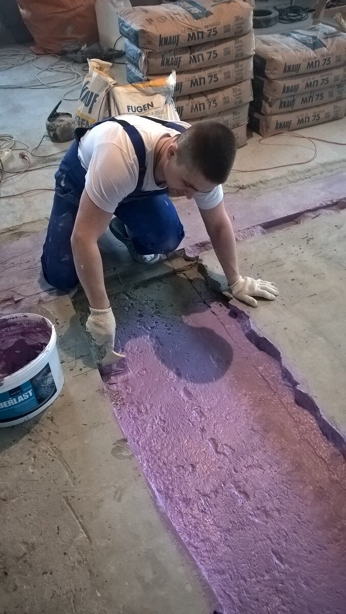 Нужно предварительно нанести валиком или кисточкой, на пол грунтовку глубокой пропитки, а после ее высыхания ( через 1 час ) намазать Маcтику, обмазывать нужно внимательно, чтобы не было разрывов, через которые может просочиться вода к соседям , когда будете заливать стяжку.