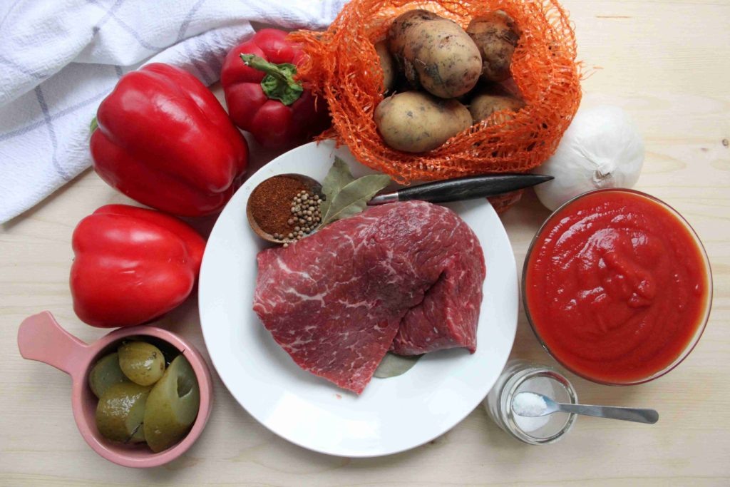 Рецепт гуляша по-венгерски из говядины: пошаговые фото Густой томатный гуляш из говяжьей вырезки — это невероятно сытно! Блюдо понравится и ценителям нежного мяса, и любителям сочных овощей, и почитателям густой томатной подливки. По этому рецепту, который относится к классической венгерской кухне, получается большая порция гуляша. Будьте уверены, на следующий день он будет даже вкуснее. Ингредиенты: -говядина (вырезка) – 1,5 кг; -картофель (молодой, некрупный) – 600 г; -перец (красный, сладкий) – 750 г; -томатная паста – 390 г; -огурцы маринованные (с рассолом) – 35 г; -паприка (сладкая, молотая) – 18 г; -кориандр (семена) – 3 г; -лавровый лист – 3 шт.; -лук (белый) – 1 шт.; -растительное масло – для обжарки; -соль (морская) – 50 г; -базилик (зеленый, свежий) – на украшение. Кухня – венгерская. Время приготовления – от 1,5 до 2,5 ч. Сначала подготовим красные сладкие перцы. Для этого вымоем их, сложим на укрытый фольгой противень, отправим