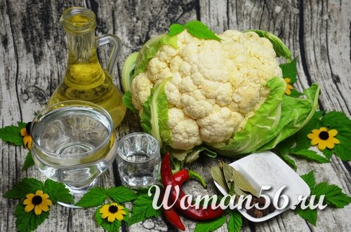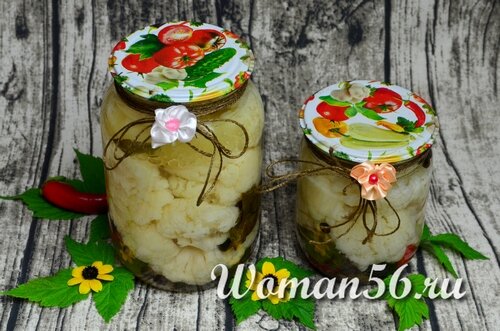 По рецепту маринованная цветная капуста на зиму выглядит очень декоративно, можно любоваться причудливыми изгибами ее соцветий. Охлажденную капусту подают с основным горячим обеденным блюдом: запеченной рыбой, мясом, отварным картофелем, грибной запеканкой. Маринованная капуста по данному рецепту получится острая с ярко выраженной кислинкой, красный жгучий перец отлично справляется со своей работой. Растительное масло частично смягчит остроту маринада. Ингредиенты рецепта: Описание рецепта маринованной цветной капусты на зиму в банках Цветная капуста хорошо приспосабливается к любым условиям хранения. О пригодности кочана для маринования можно судить, взглянув на прилегающие к нему листья. Если листочки - светлые и свежие, то соцветия капусты будут хорошо мариноваться в банках и будут аппетитно хрустеть даже зимой. Признаком старения цветной капусты становится появление серо-черных пятен. Соцветия с пятнами можно срезать, но постаревшие экземпляры не стоит мариновать, д