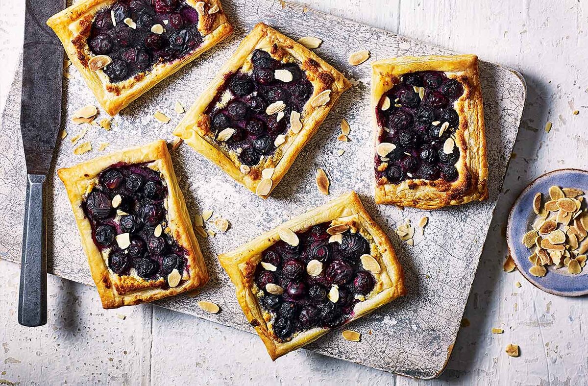 Это оригинальное печенье выглядят так, как будто они вышли прямо из окна кондитерской, но на самом деле его очень легко сделать. Готовое, слоеное тесто - это очень удобно для быстрого и легкого выпекания. Ингредиенты: 320 г готового слоеного теста 50 г сливочного масла 50 г лимонного сахара 1 яйцо 100 г молотого миндаля 1/2 ч.л. ванилина 250 г черники 2 столовые ложки обжаренного миндаля (необязательно) Как приготовить печенье с черникой 1. Разогреть духовку до 220 ° C. Возьмите 2 листа пергамента бумаги для выпечки. Положите противень без бумаги в духовку, чтобы нагреть. Разверните тесто и разрежьте его на 8 равных прямоугольных частей. Отчертите 5-миллиметровую границу вокруг края каждого прямоугольника, стараясь не прорезать тесто. Поместите 4 кусочка теста на каждый лист бумаги для выпечки. 2. Взбить масло и сахар в миске до однородной массы, затем измельчить миндаль и экстракт ванили, чтобы сделать жесткую пасту. Помажте по каждому прямоугольнику печенья, оставаясь в пр