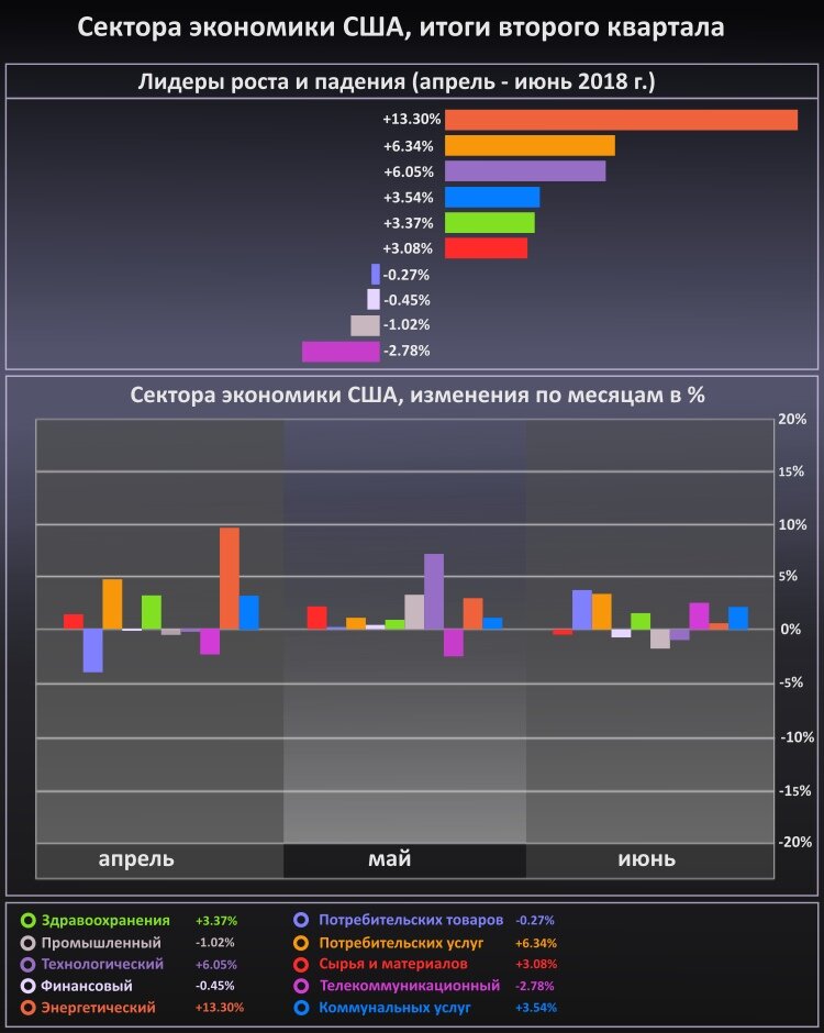 По итогу второго квартала 2018 года индекс S&P 500 прибавил 2,93%, Dow Jones Industrial Average прибавил 0,70%, а индекс Nasdaq Composite второй квартал закрывает в зеленой зоне с ростом в 6,33%.