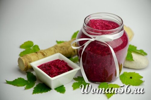 Хрен не зря занимает место на грядке: одинаково полезными оказываются «и вершки, и корешки». Приготовить хрен со свеклой не сложно, это популярная и «вездесущая» закуска, ее подают с холодцом, салом, любыми блюдами из свинины. Если на плите ожидает своего часа кастрюля с наваристым борщом, то появляется повод намазать ломтики хлеба тонким слоем острой свекольной закуской. Хрен не подвергается тепловой обработке, поэтому его бактерицидные свойства проявляются максимально: он «чистит» организм, обеспечивает его витаминами и прочими полезными веществами. Ингредиенты рецепта: Как приготовить хрен со свеклой. Рецепт с фото Если корень хрена свежий, только с грядки, можно обойтись без предварительного замачивания. В свежем корне присутствует небольшое количество жидкости, поэтому его можно измельчить без особых проблем. Корень, залежалый, постепенно «деревенеет», его придется замочить на 30 минут в холодной воде, затем моют и чистят. Свеклу моют и отваривают до мягкости. Хре